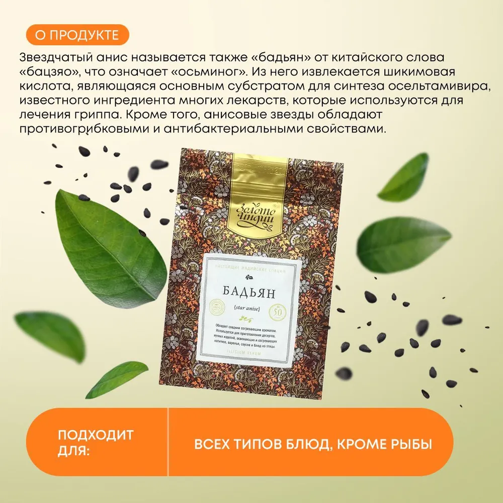 Это классическая пряность, которую еще до нашей эры использовали на Востоке. В Европу бадьян (звездчатый анис целый) попал в начале XI века и сразу получил признание в качестве пряности и лекарственного средства. Звездчатый анис целый (купить который вы можете у нас также в молотом виде) был популярен и в России.