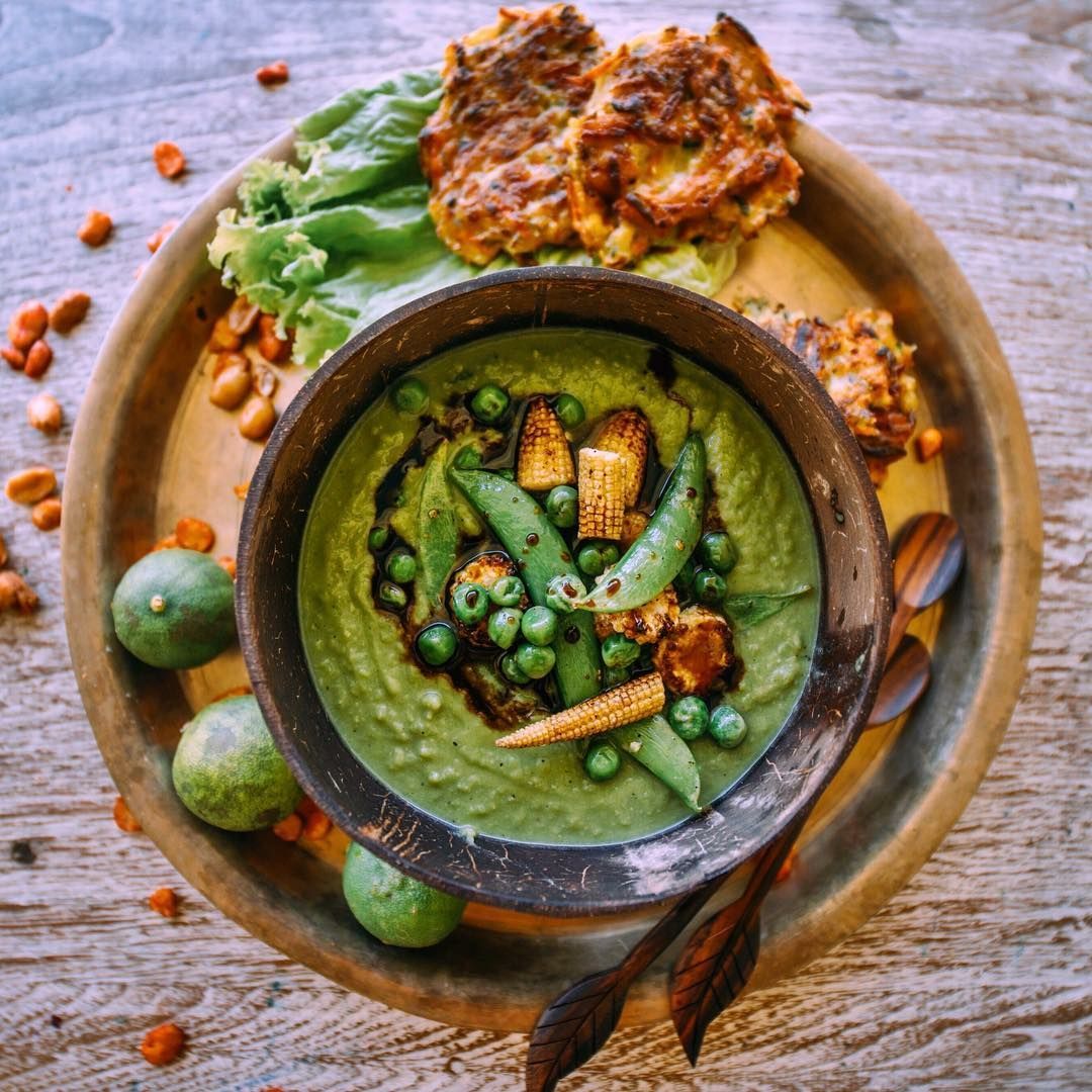 Это ароматное картофельное пюре приправлено семенами горчицы, свежими листьями карри, куркумой и имбирем, а также смешано с горошком.