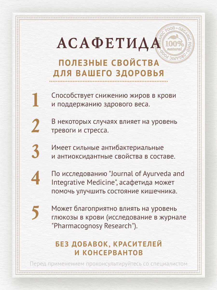 Асафетида – пряность, малоизвестная в Европе, но высоко ценимая в Азии и на Востоке. Асафетида – чистая смола молотая – это особая специя, которую получают из застывшего сока, вытекающего из корней растения ферула. Надрезав корни ферулы, получают больше литра сока из одного растения.