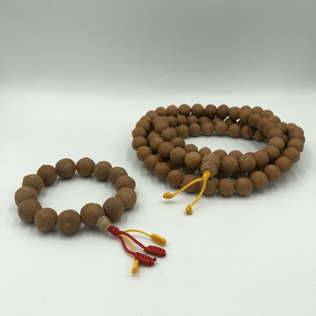 Собраны на жёлтом или красном шнуре из 108 обычных бусин и одной гуру-бусины, зафиксированы нерегулируемым защитным узлом.