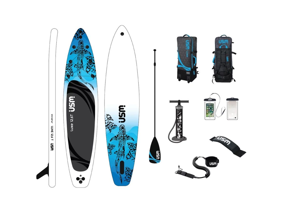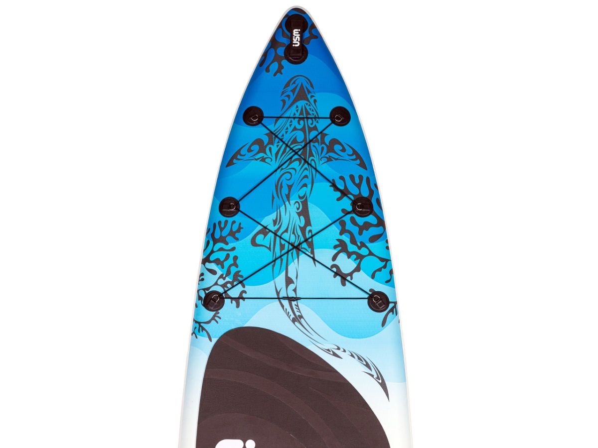 Материал - 2х слойный ПВХ Woven Drop Stitch. Материал sup board - woven, тканный материал, обеспечивающий жесткость за счет структуры производства материала. Материал сложной тканевой структуры и уникальной технологии поэтапного напыления слоев. Технология тканого стежка используется сверху и снизу доски, с безклеевым ламинированием ПВХ, со сниженной долей пластика в составе. Переплетение нитей обеспечивает структуру для полиэфирной пряжи, что придает доске форму. Вязаные волокна обладают мягкими и эластичными свойствами, в то же время превосходит предыдущие технологии по жесткости и гибкости.Нити пряжи весят меньше чем аналоги (MSL), они более отзывчивы на усилия ног гребца. Данная технология облечает вес доски на 1,5 килограмма, в сравнении с аналогами (MSL).