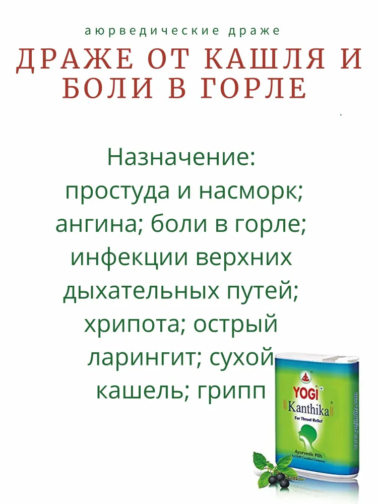 Йоги Кантика - аюрведические драже, которые помогут эффективно справиться с кашлем, хрипотой и першением в горле, устранят воспаления, покраснения, отеки и болевые ощущения в горле.