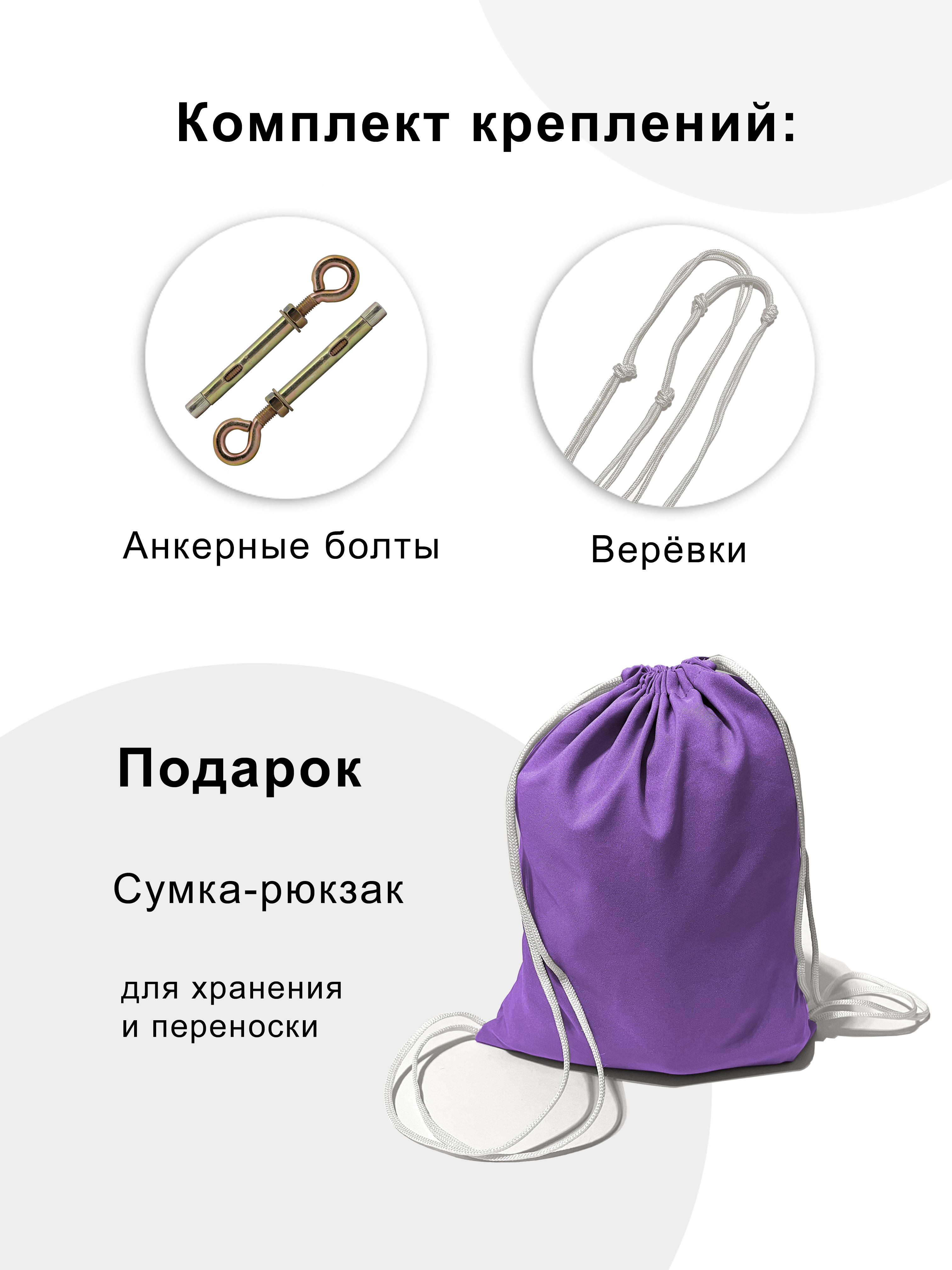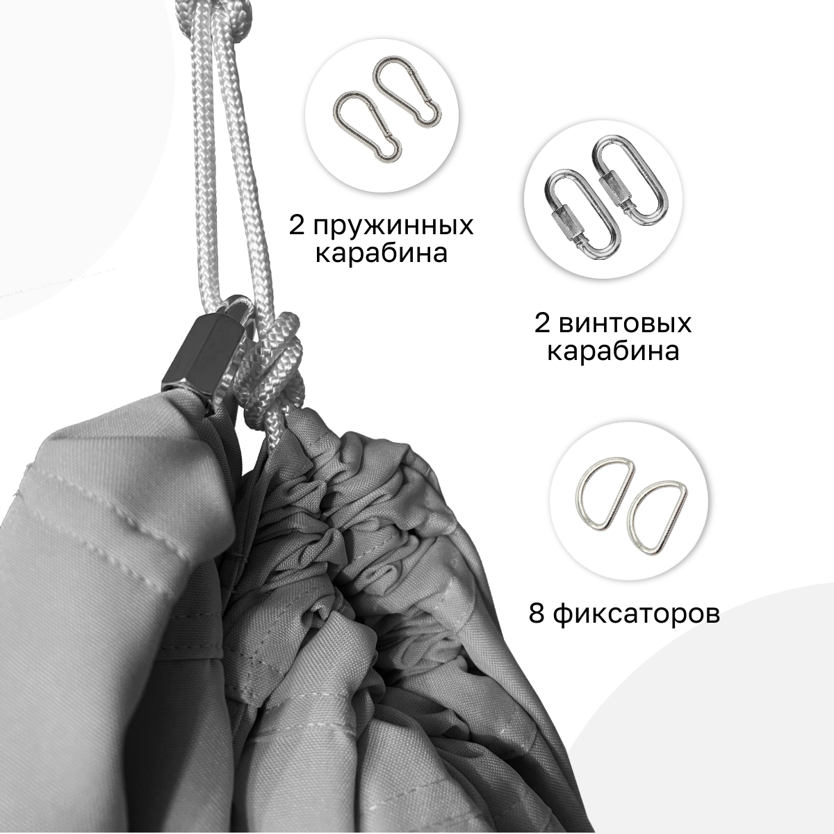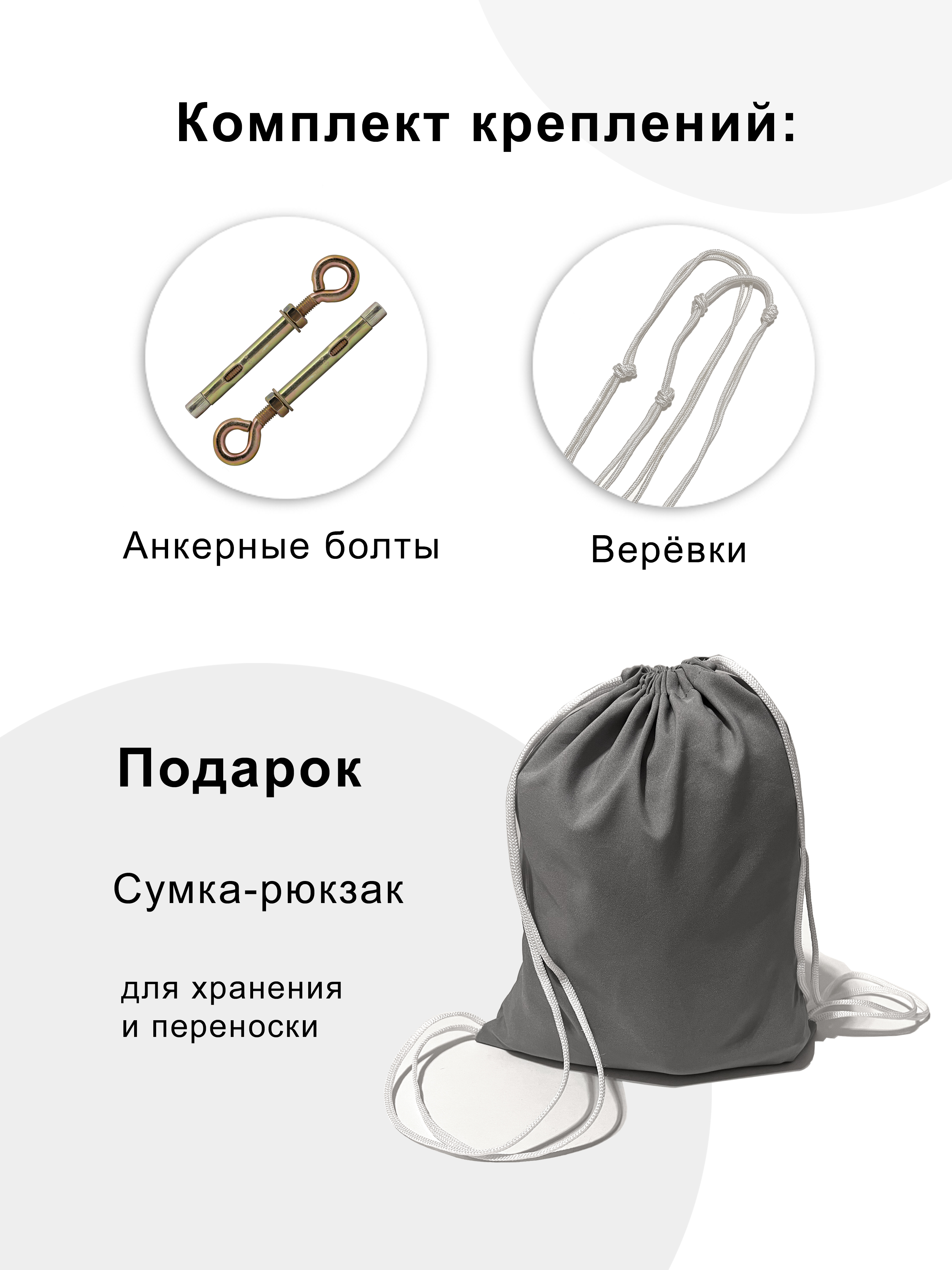 • Поставляется в комплекте с необходимыми креплениями: в набор входят карабины, веревки, анкерные болты, инструкция по установке и использованию гамака.