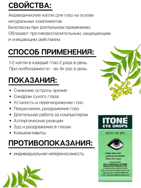 глазные капли АЙТОН — стерильный раствор, содержащий водные экстракты следующих индийских растений:(in v/v) Nimba (Azadirachta Indica) 5%-Ниим Азадиратха Индийская