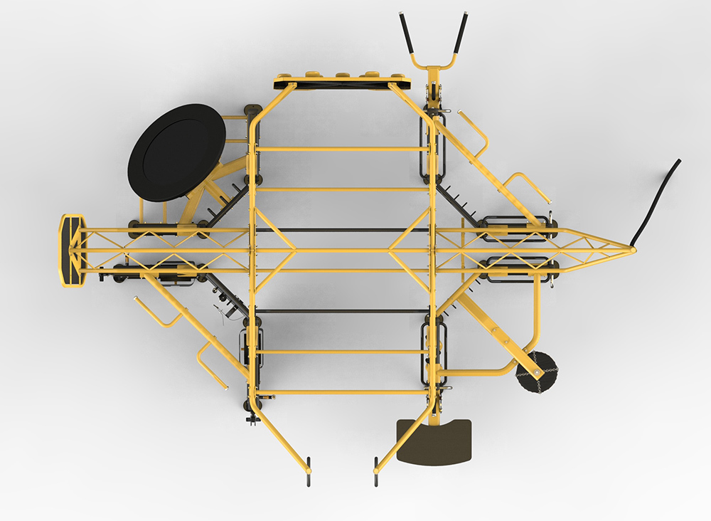 - Премиальный многофункциональный комплекс состоит из 4х модулей: зоны растяжки, зоны бокса (без боксерского мешка), зоны реакции, двойной регулируемой тяги, соединенных при помощи модифицированной базы, включающей высокую мишень для мячей, платформу для скалолазания, высокие крепежи для каната и колец, а также платформу для упора в стойке на руках.