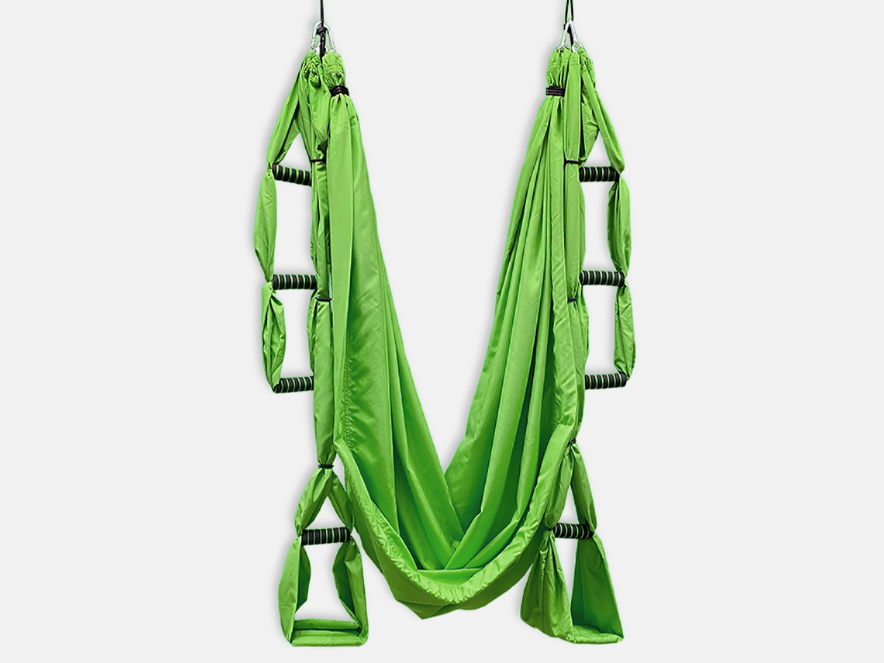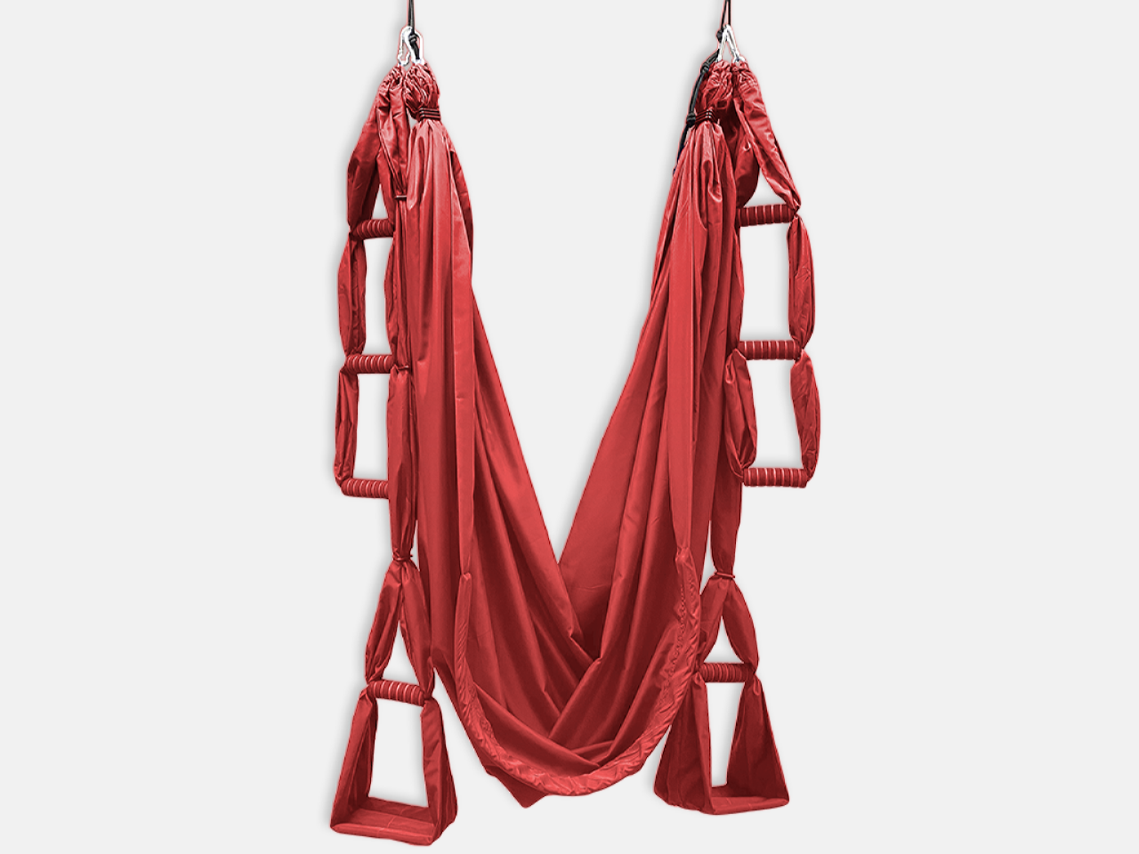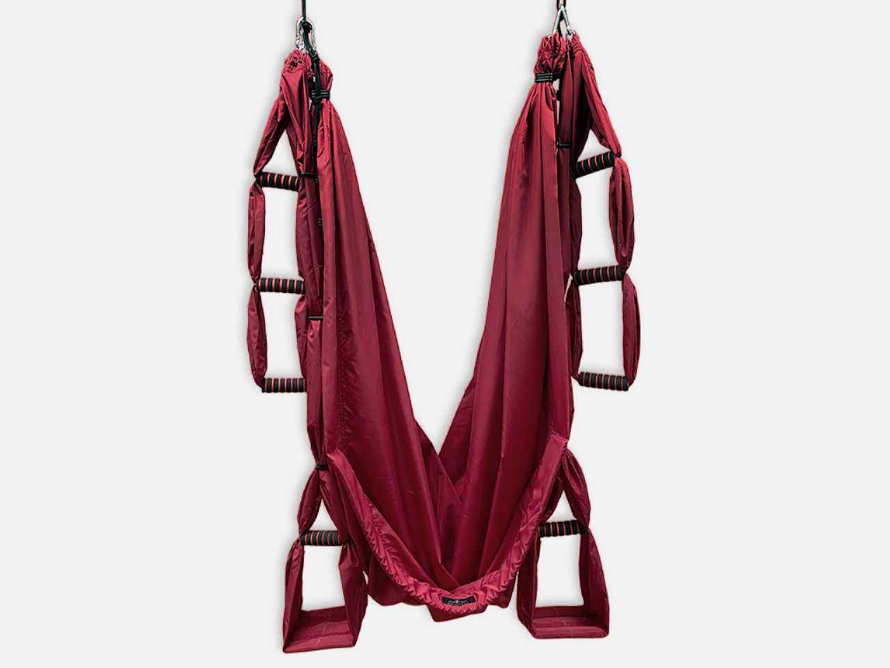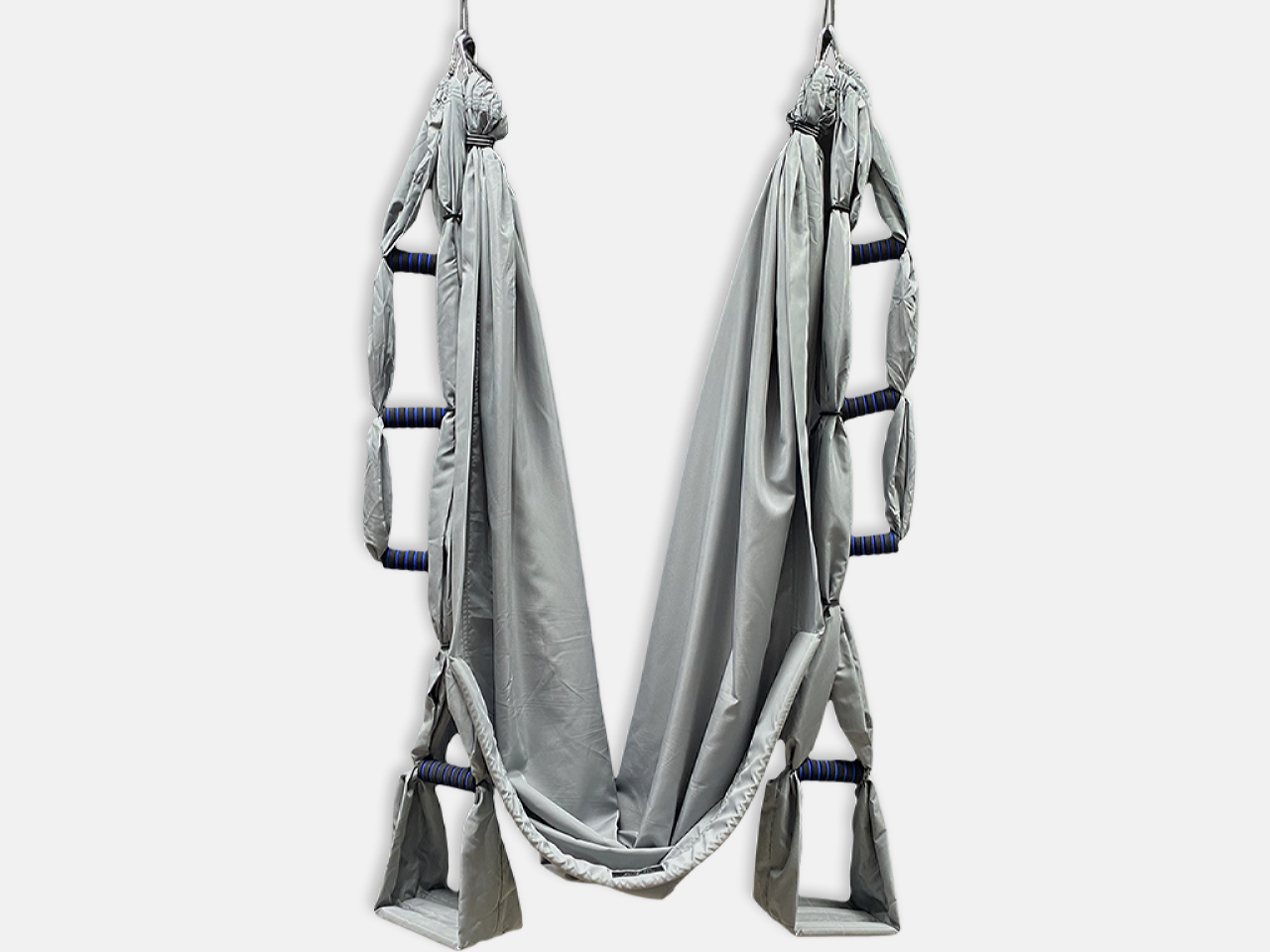 - Две одинарные ручки в виде складных «стремян» для ног. Ручки имеют поверхность в виде мягкой складной платформы, которая делает использование йога-гамака максимально удобным и комфортным