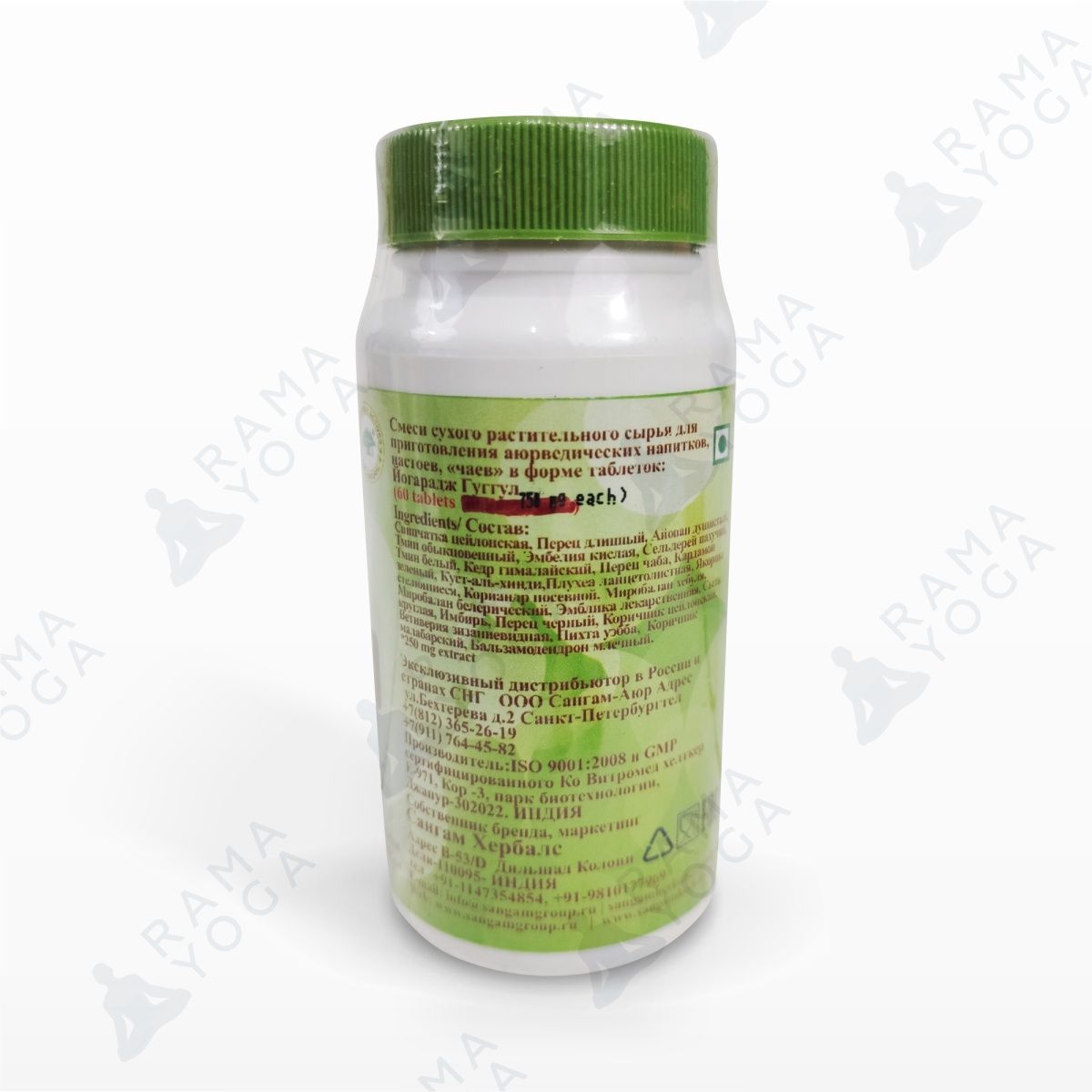 Гуггул стимулирует центры саморегуляции в организме, выводит шлаки на клеточном уровне, улучшает микроциркуляцию в суставных тканях и позвоночнике, активизирует регенерацию хрящей. Выводит из организма нерастворимые соли, после применения препарата суставная боль довольно быстро проходит.