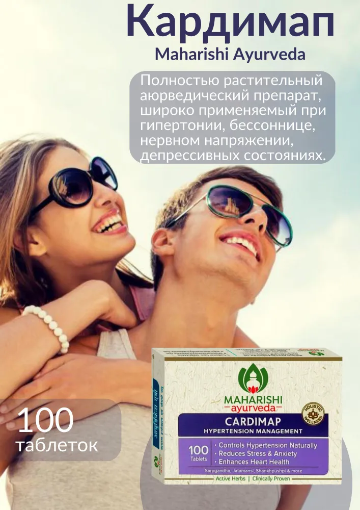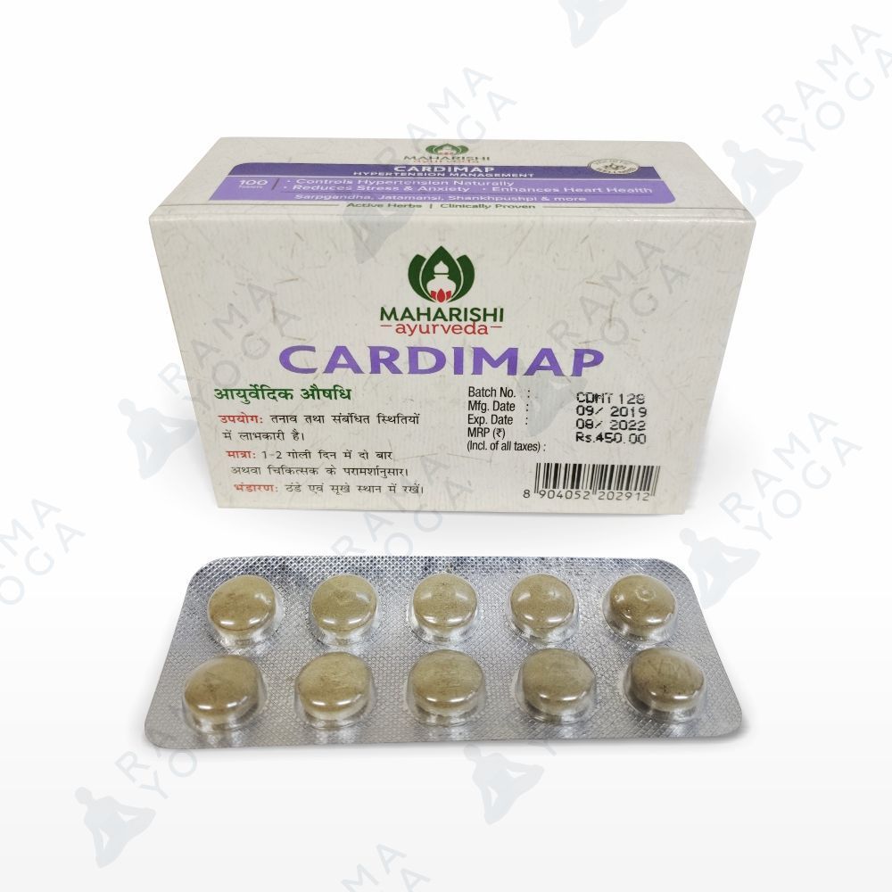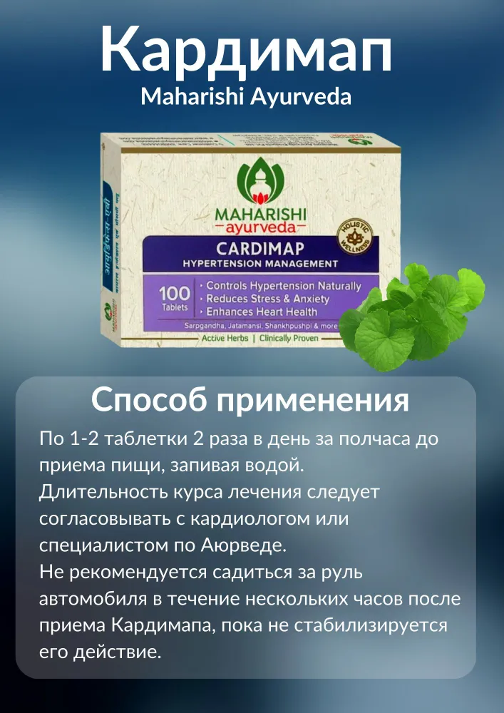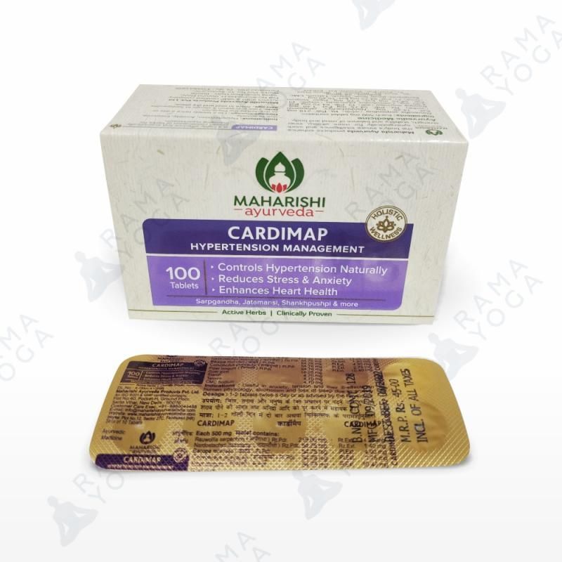 Кардимап Maharishi Ayurveda — это уникальная комбинация трав, которая рекомендуется в аюрведической системе медицины для снижения артериального давления, беспокойства и напряженности. Кардимап применяется при бессоннице, и совершенно не влияет на обычный распорядок дня пациента. Кардимап содержит такие известные противогипертонические и успокаивающие компоненты как сарпагандха (Rauwolfia serpentina), джатаманси (Nardostachys jatamansi), шанкхпушпи (Convolvulus pluricaulis), брахми (Bacopa moniera) и пиппали (Piper longum).