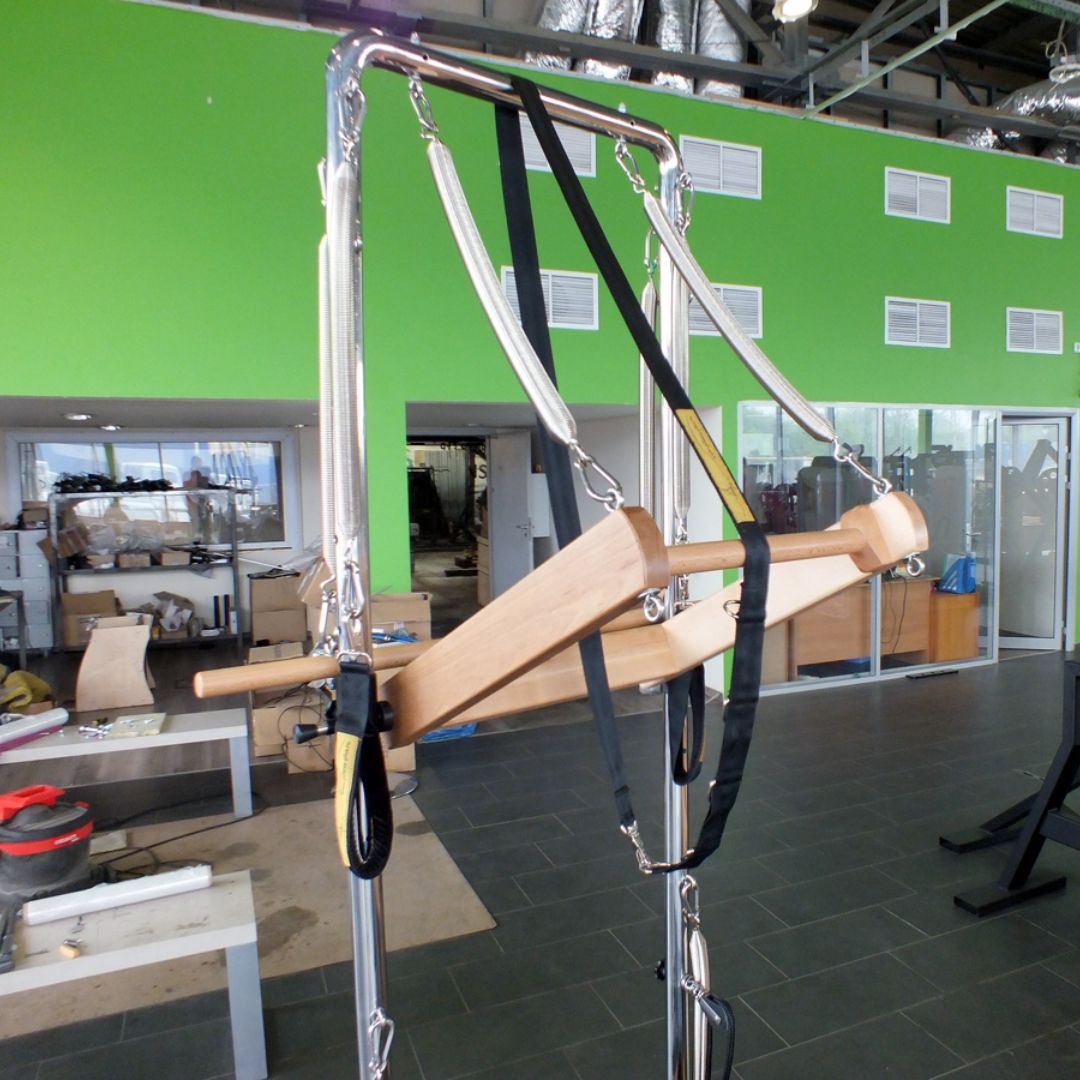 Стол для пилатеса позволяет висеть на верхних и боковых стойках, подтягиваться, выполнять множества упражнений для спины и коррекции позвоночника. Плюс, отталкиваться от стоек и выполнять разные жимовые движения. Широкая поверхность комбинированного стола и усиленные опоры из высококачественной стали создают комфортные условия для занятий. Станина стола из клееного бука. Вся конструкция скреплена особым способом, что делает её прочной и выносливой. Деревянные поверхности покрыты яхтенным лаком на водной основе. Столешница оборудования из многослойной фанеры, обитой эко кожей.