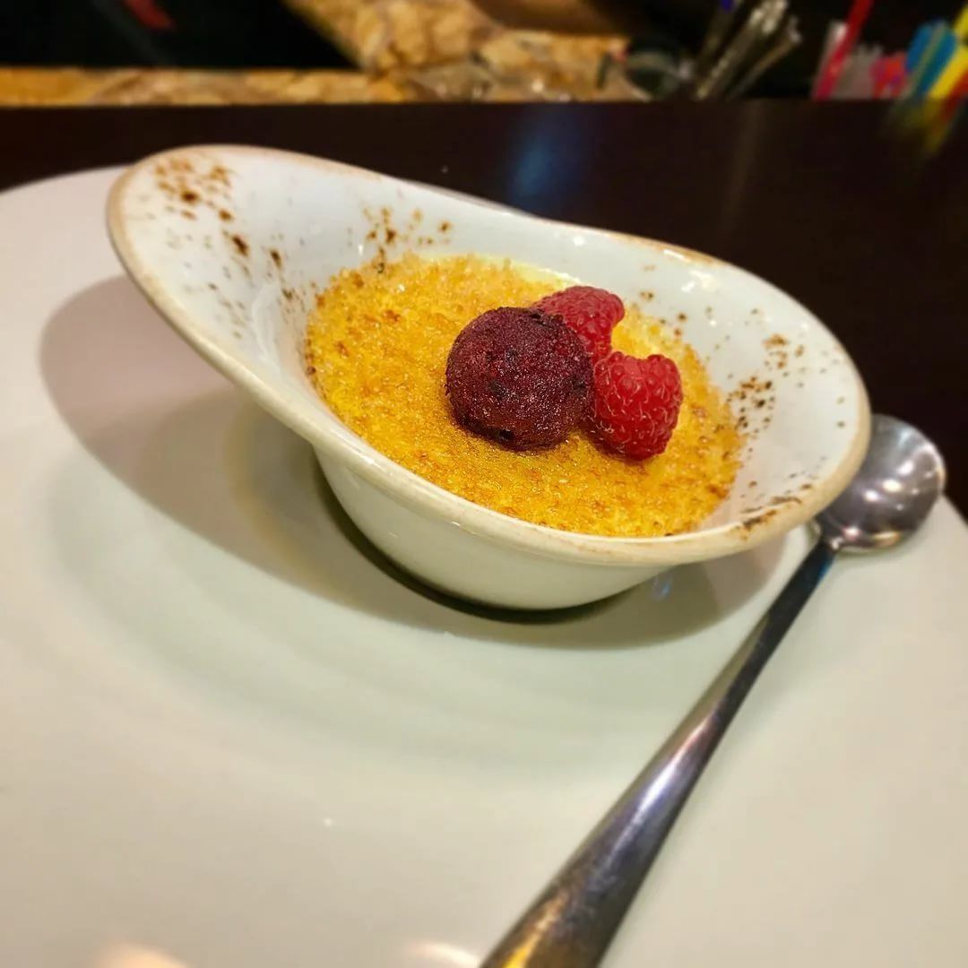 Застывший крем посыпать сахаром и обжечь горелкой до образования хрустящей корочки, как у крем-брюле. Прогреть под грилем в течение 10 минут. Подавать сразу же.