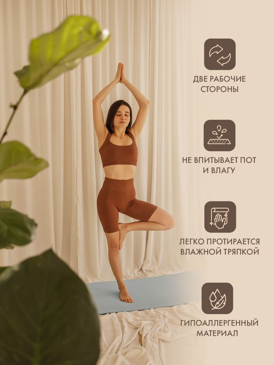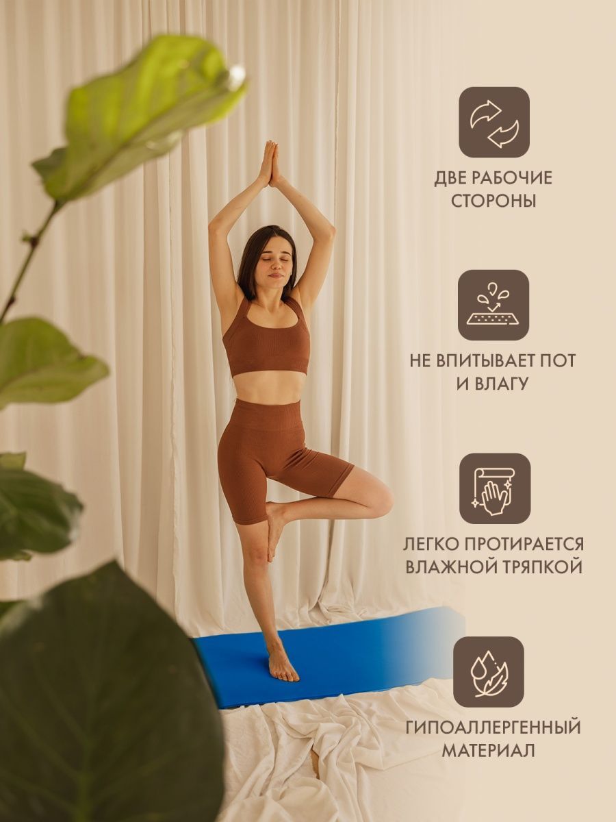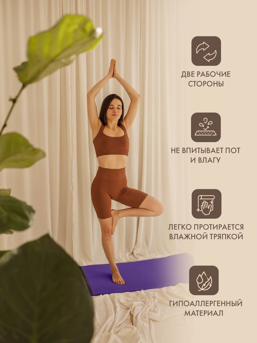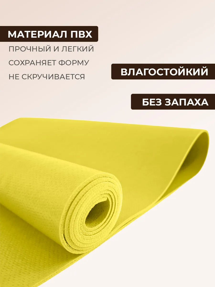 Мягкий и удобный коврик изготовлен из нетоксичных материалов, поэтому абсолютно безвреден для вашей кожи. Не скользит и имеет довольно большой размер (185 см), что поможет расслабиться и сосредоточиться на выполнении асан.
