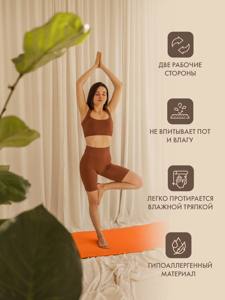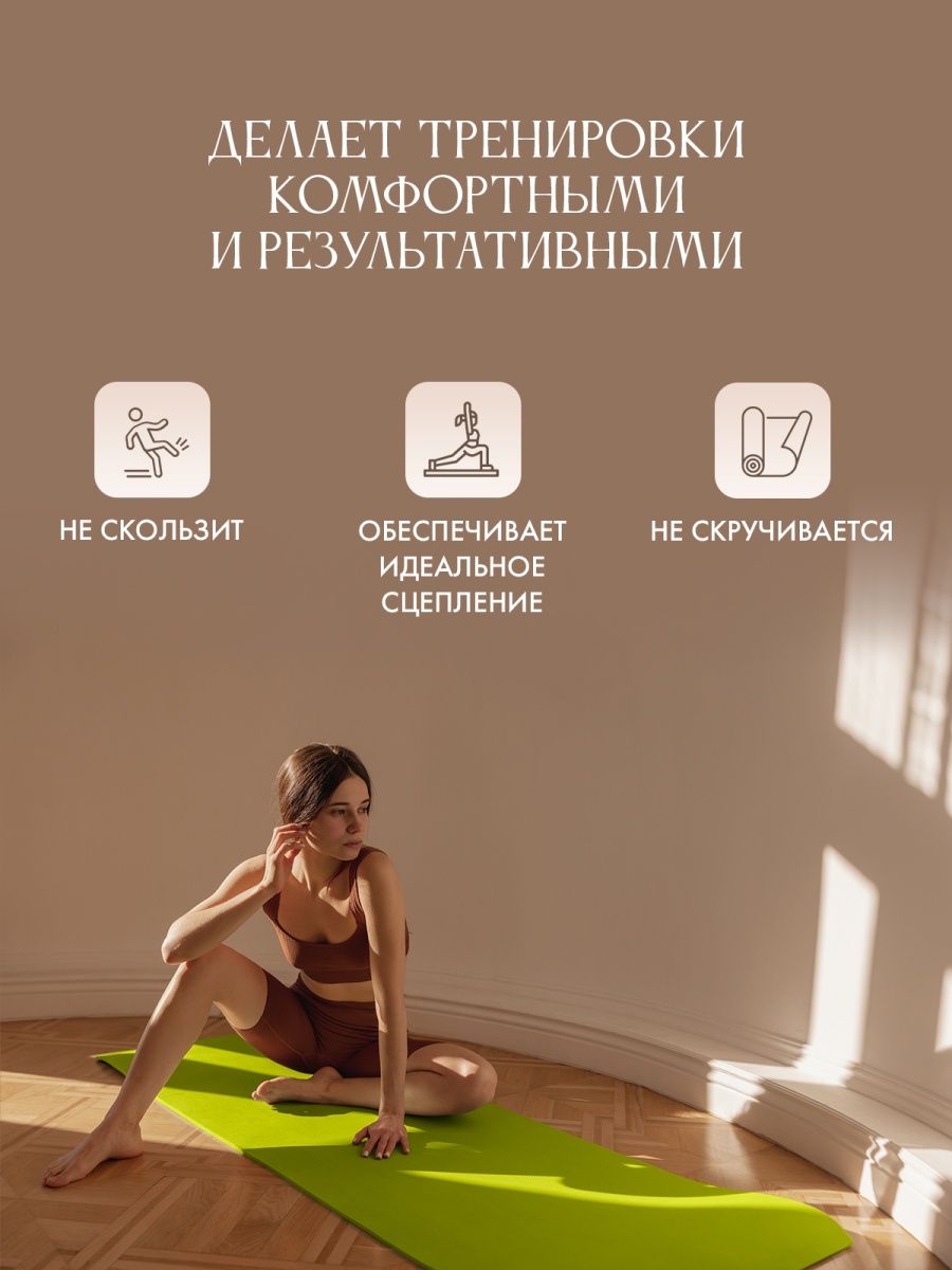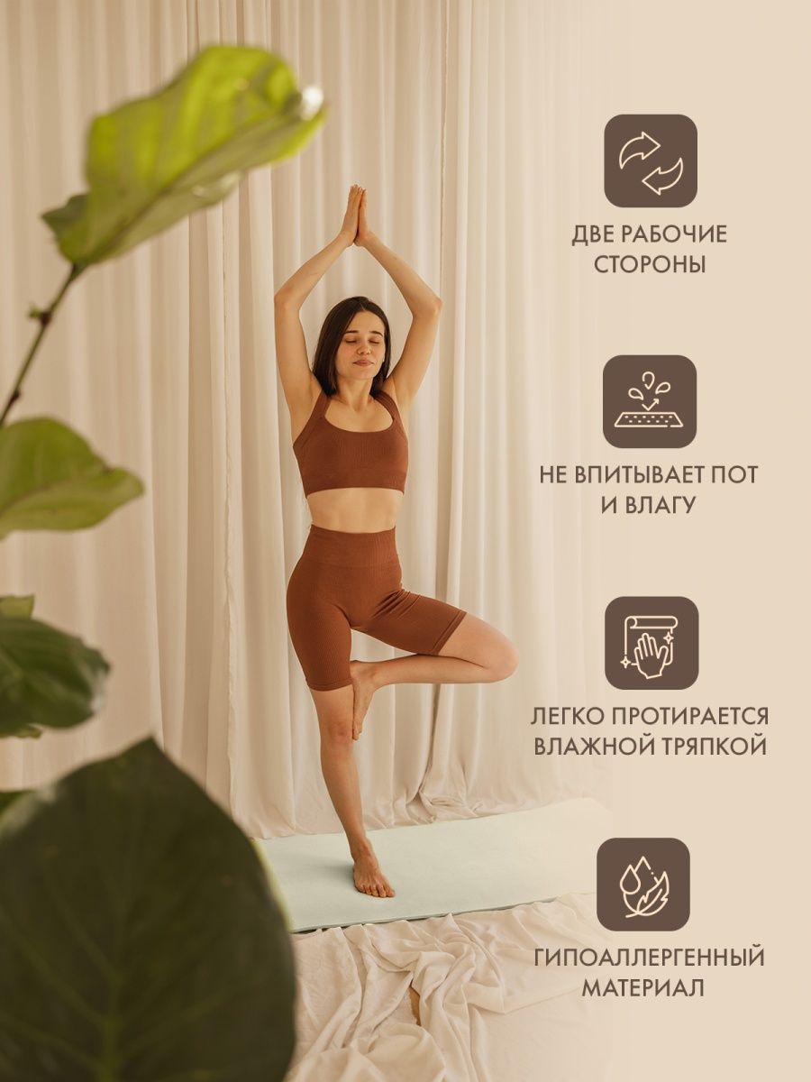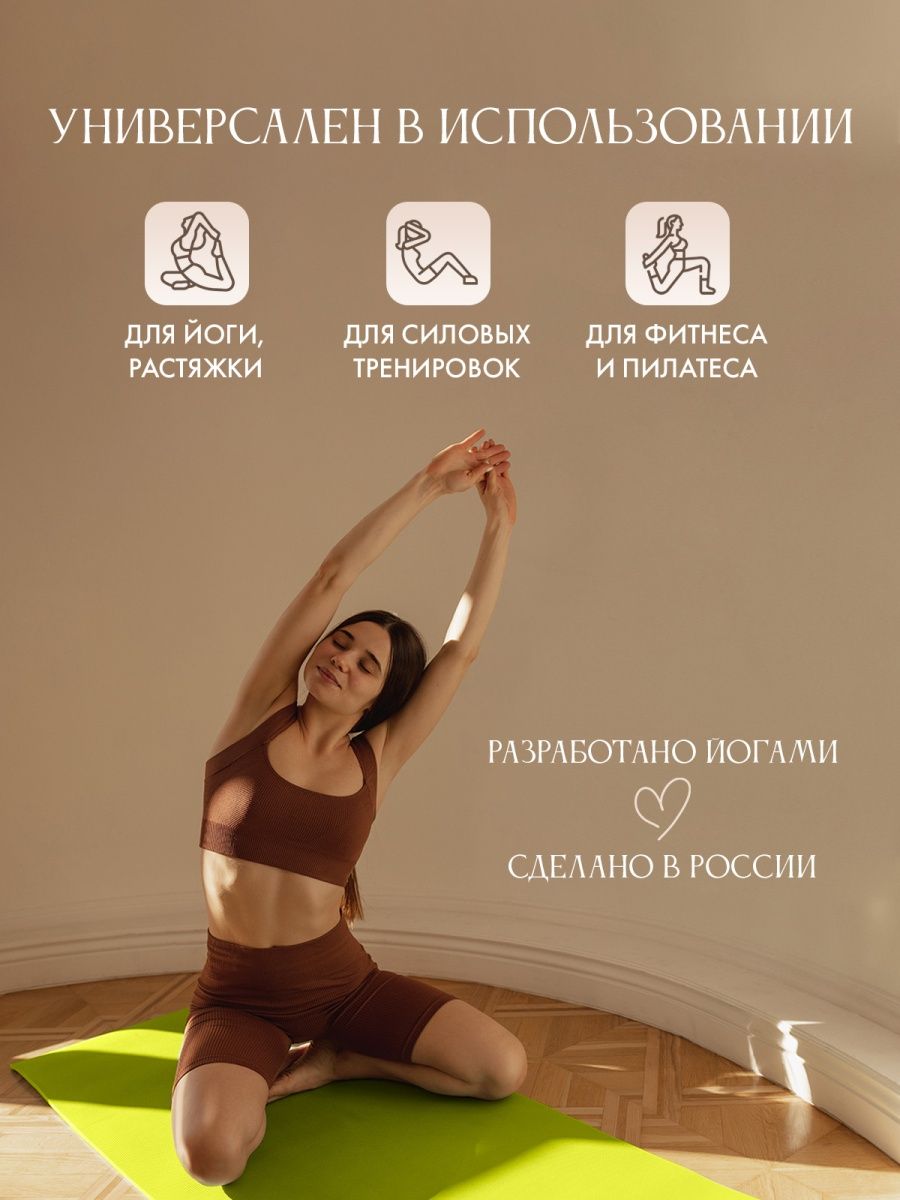 Мягкий и удобный коврик изготовлен из нетоксичных материалов, поэтому абсолютно безвреден для вашей кожи. Не скользит и имеет довольно большой размер (185 см), что поможет расслабиться и сосредоточиться на выполнении асан.