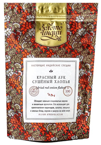 Красный лук сушеный хлопья Золото Индии обладает сладковатым вкусом и пикантным ароматом. Используется для приготовления маринадов, салатов, овощных и мясных блюд, соусов и закусок во всем мире. Благодаря бережной сушке в естественных условиях, продукт полностью сохраняет оригинальные вкусовые и целебные свойства.