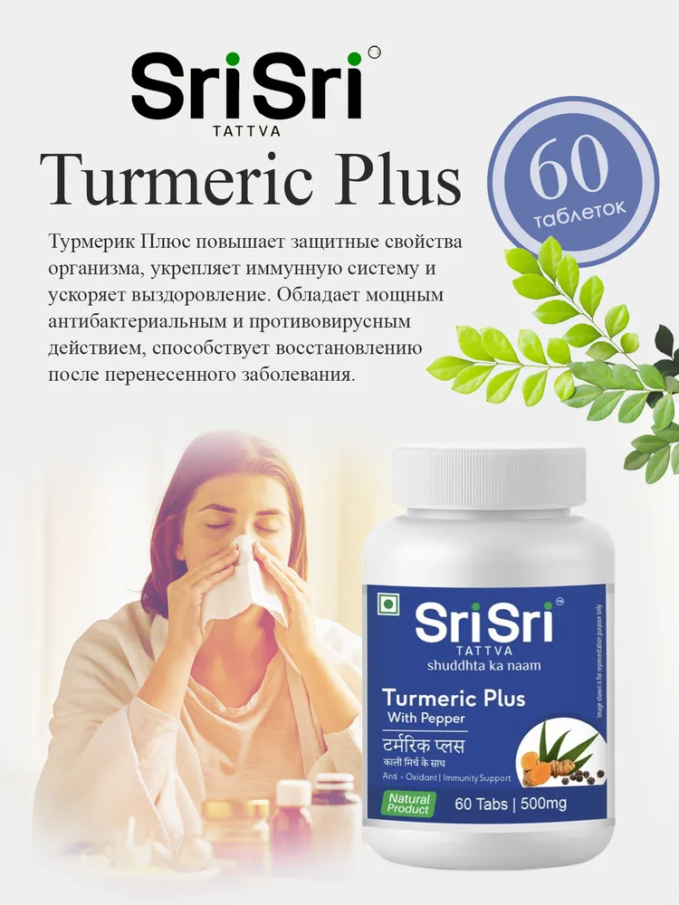 Турмерик плюс, Куркума с чёрным перцем (Turmeric Plus With Pepper) компании Sri Sri - препарат, содержащий куркумин, целебную специю с противовоспалительным, антисептическим и антибактериальным действием.