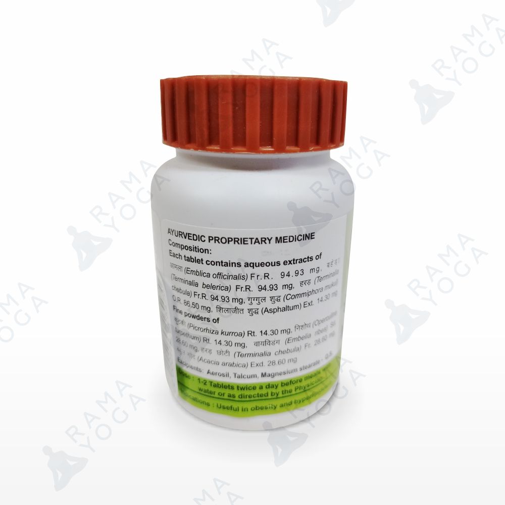 1-2 таблетки 2-3 раза в день, в зависимости от веса тела за полчаса до еды или через 1-1,5 часа после еды, запивая тёплой водой. Если страдаете запорами, то принимать Triphala Churna по 1 ч. ложке с тёплой водой 1 раз в день перед сном.