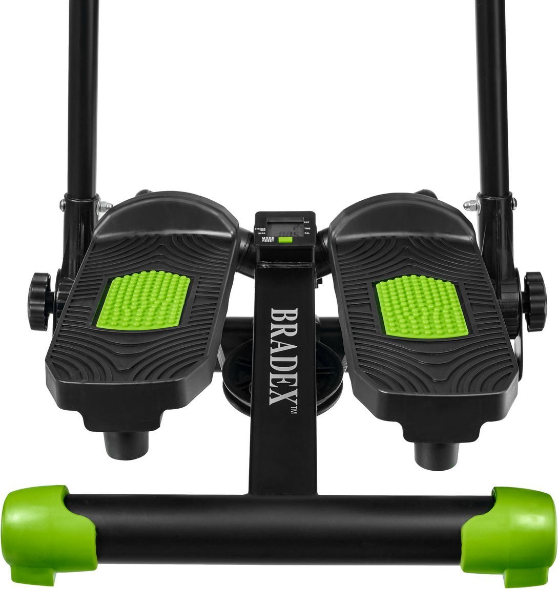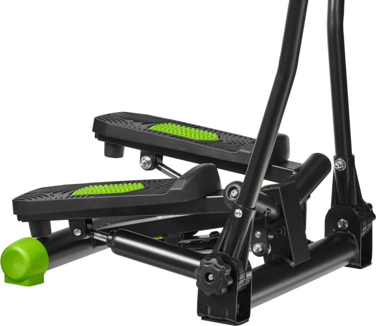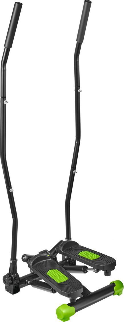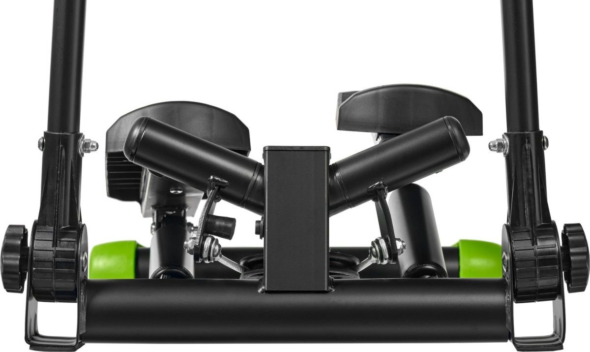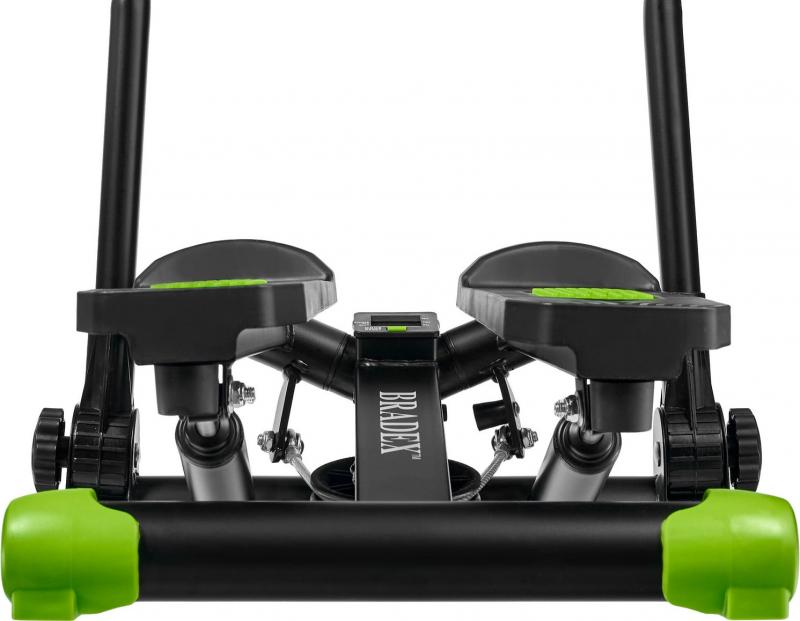 У министеппера стальная, устойчивая база, которая выдерживает вес до 100 кг. Система нагружения осуществляется при помощи 2 гидравлических цилиндров. Большие педали имеют нескользящее покрытие, также предусмотрена возможность регулировки высоты педалей. Поручни степпера регулируются по углу наклона. Функциональный тренажер имеет цифровое устройство контроля, состоящее из дисплея и кнопок управления. На нем отражается время, количество шагов, ритм, калории, режим сканирования. Поворотный министеппер с поручнями отличается эргономичным дизайном и отлично вписывается в домашний интерьер.