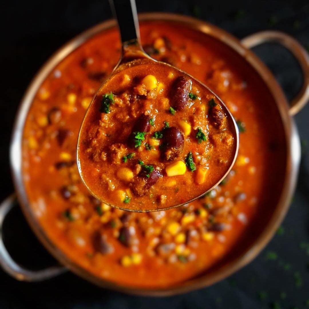 В глубокой сковороде разогреть масло и обжарить на среднем огне лук до прозрачности и мягкости. Добавить перец, чеснок, молотый чили, паприку и кумин, хорошо перемешать и готовить в течение 5 минут, помешивая время от времени.