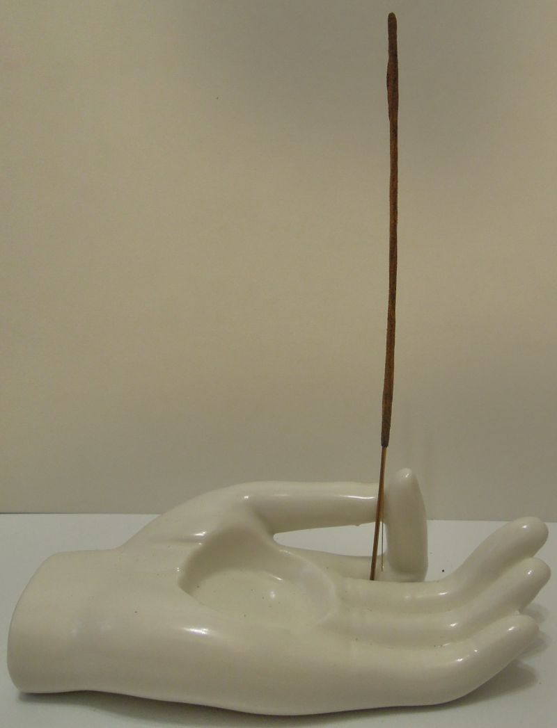 Керамическая подставка для круглой свечи в металлической гильзе или благовоний (палочек, конусов и других). Специального отверстия для ароматических палочек-благовоний в подставке нет, палочку можно размещать, как показано на фото.