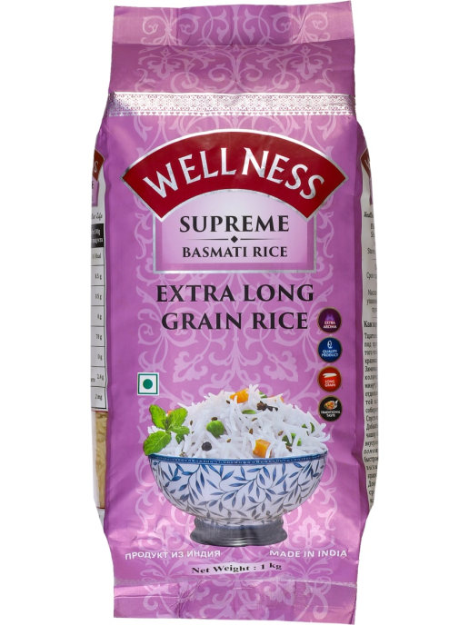 Rice Basmati Supreme WellNess – один из самых вкусных и дорогих сортов риса в мире. Зерна имеют слегка продолговатую форму. Они обладают изумительным ароматом и сладким привкусом. Главное преимущество риса Басмати Суприм заключается в том, что после приготовления он остается рассыпчатым.