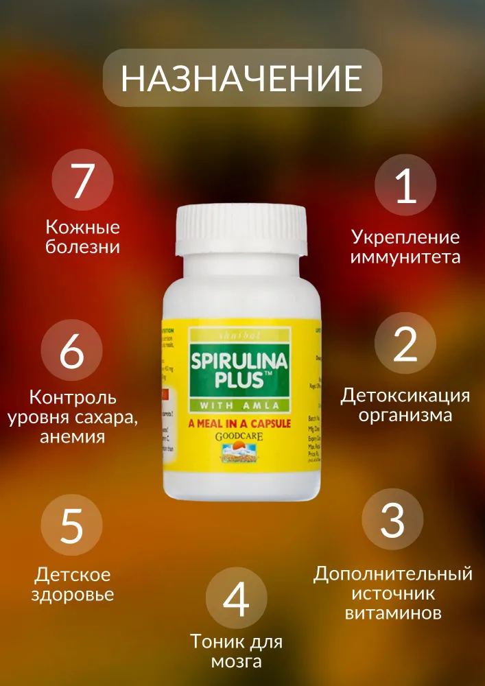 Каждая капсула содержит: Шайбал (Спирулину) - Ceratophyllum demersum - 450 mg, порошок Амлы (Emblica officinalis) - 150 mg.