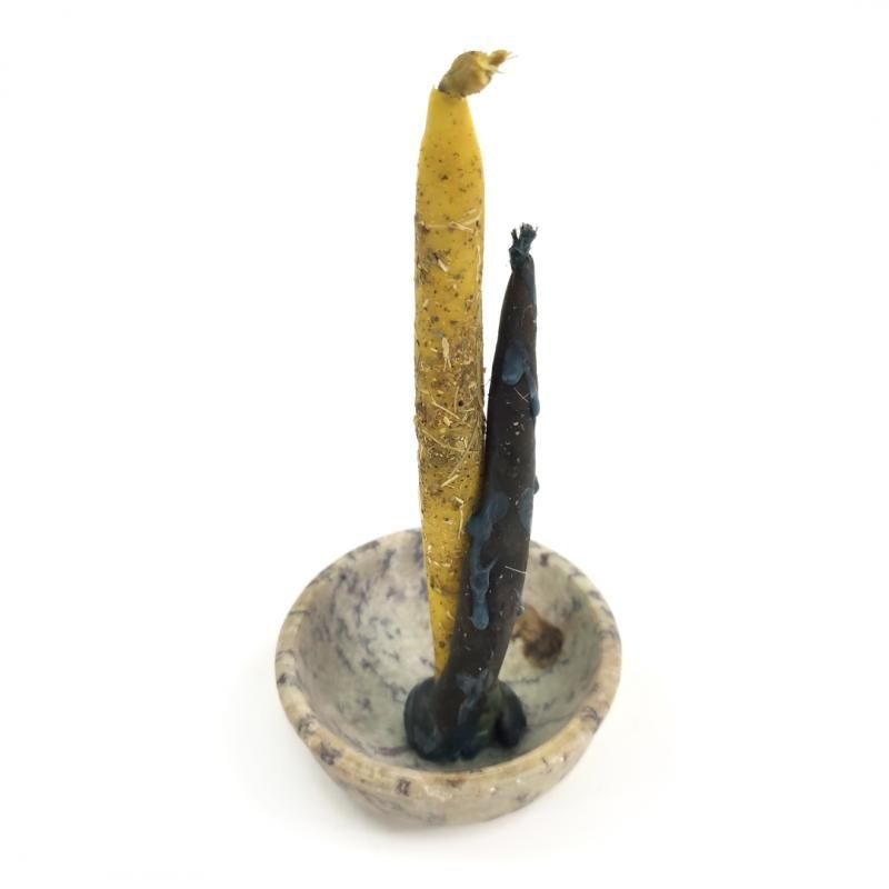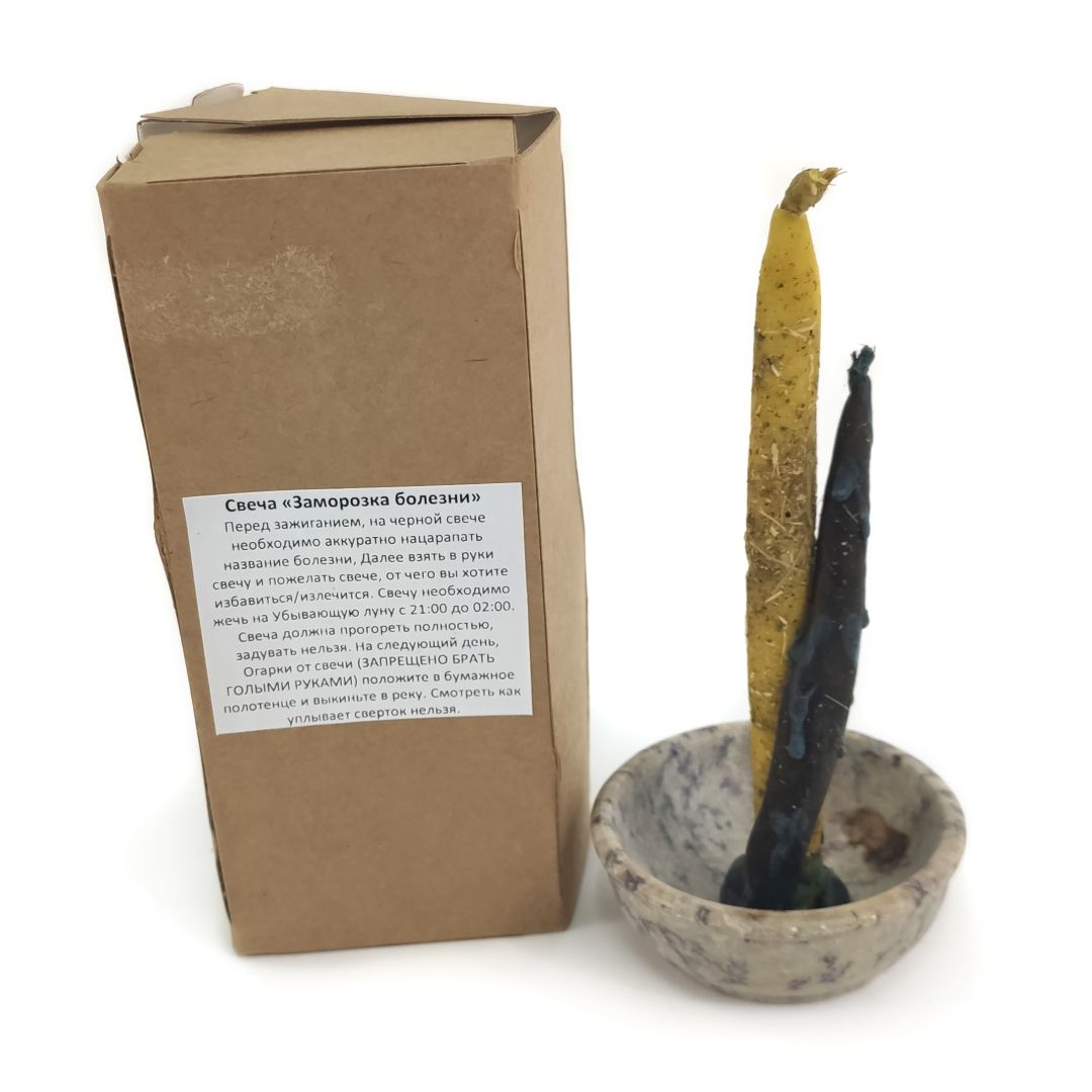 Перед зажиганием, на черной свече необходимо аккуратно нацарапать название болезни, далее взять в руки свечу и пожелать свече, от чего вы хотите избавиться/излечится. Свечу необходимо жечь на Убывающую луну с 21:00 до 02:00. Свеча должна прогореть полностью, задувать нельзя. На следующий день, прогарки от свечи (запрещено брать голыми руками) положите в бумажное полотенце и выкиньте в реку. Смотреть как уплывает сверток нельзя.