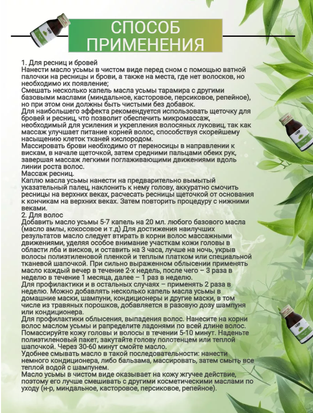 Добавляйте до 10 капель масла Усьмы в 15 мл любого базового (кунжутного, кокосового, репейного). Втирайте массажными движениями полученный состав в кожу головы. Затем на 2-3 часа оставляйте состав под полиэтиленовым пакетом и полотенцем. При лечении облысения состав можно оставлять на всю ночь. Вы также можете добавлять масло в средства для мытья волос и в маски.