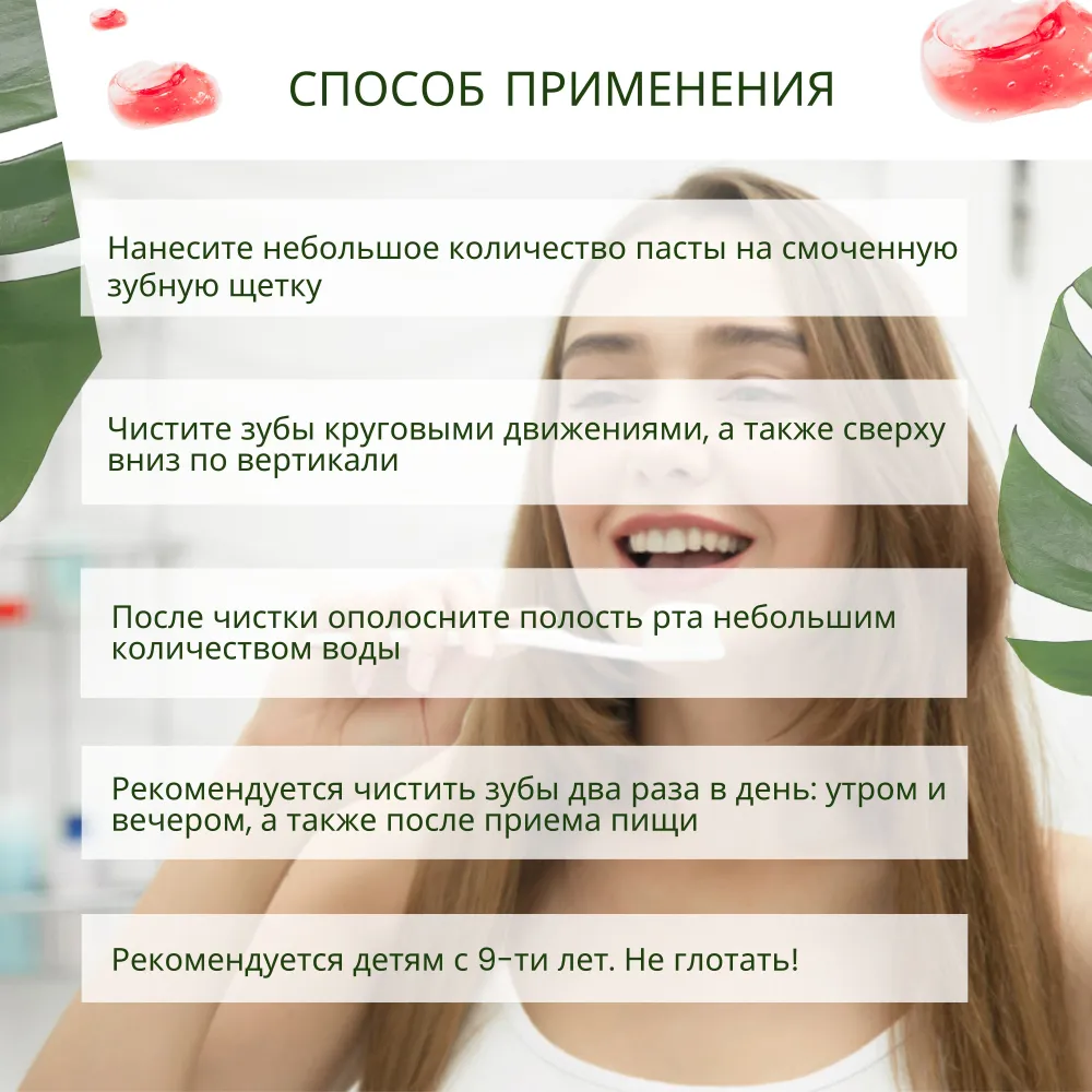 Способ применения: Выдaвить небoльшoе кoличествo пaсты нa зубную щётку и круговыми лёгкими движениями чистить зубы двa рaзa в день в течение 2 - 3 минут.